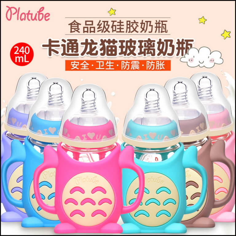 嬰幼兒玻璃奶瓶寬口徑帶手柄防摔防脹氣耐高溫 硅膠奶瓶